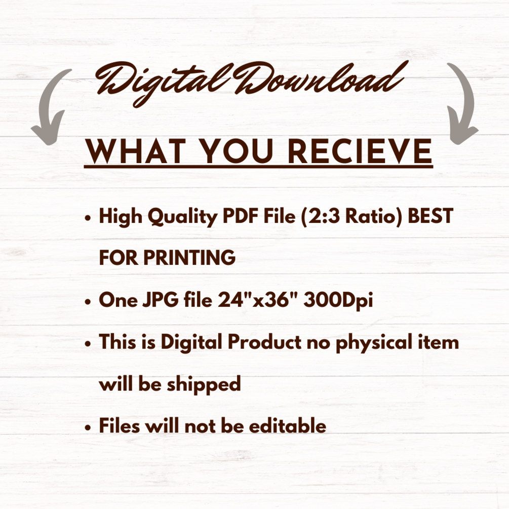 --WHAT YOU GET-- 1. One High Quality PDF File and One JPG File 300dpi For Your Wall Art and Printable designa) a) The PDF File Include a 2:3 Ratio of Image. For Printing Sizes:4"X6", 8"X12", 12"X18",16"X24",20"X30", 24"X36" (The Sizes are in Inches) b) A JPG file of 24"X36"